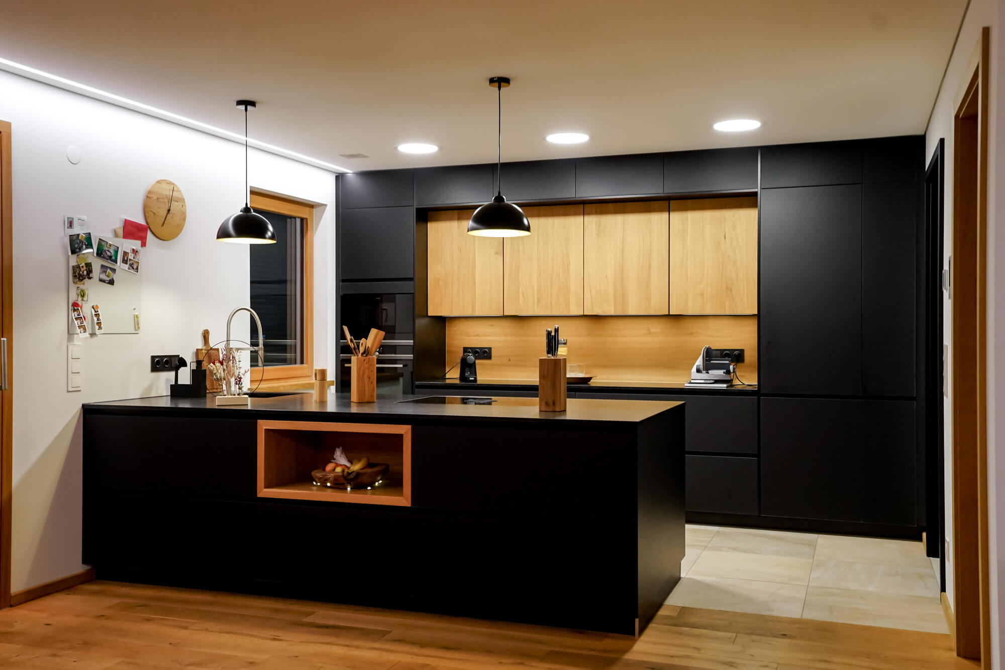 Designküche Schwarz mit Massivholz